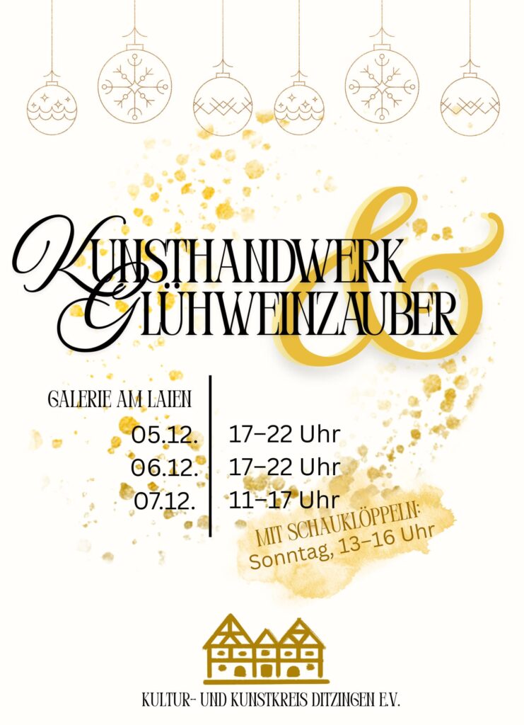 Unsere Kunsthandwerker:innen im Verein werden am Adventszauber der Stadt Ditzingen in unserer Städtischen Galerie am Laien ihre Werke zum Verkauf anbieten. Sie freuen sich über Ihr Kommen. Öffnungszeiten: Freitag, den 5.12.2025 17.00H – 22.00h Samstag, den 6.12.2025 17:00h – 22:00h Sonntag, den 7.12.2025 11:00h – 17:00h