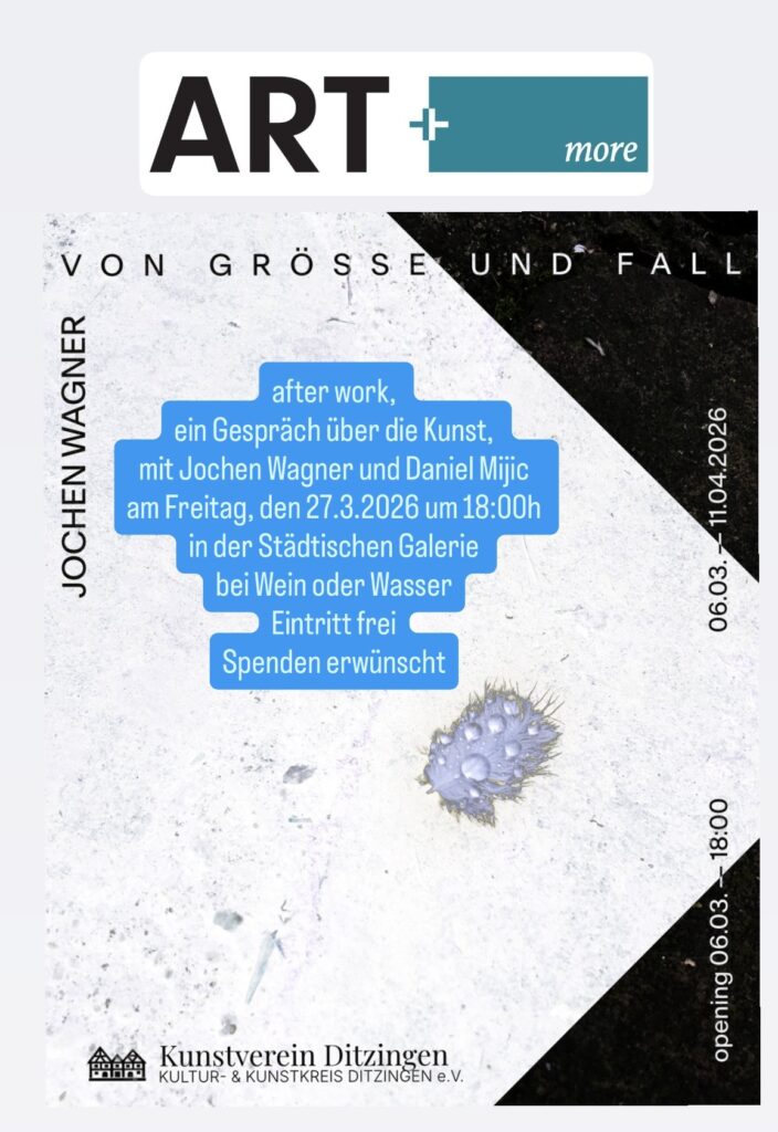 Jochen Wagner – eine Führung durch seine Werke. Bei einem Glas Wein oder Wasser in lockerer Atmosphäre stellt Daniel Mijic (künstlerisch-technischer Lehrer in der Werkstatt für Druckgraphik an der Akademie der Bildenden Künste Stuttgart) Fragen an den Künstler. Der Eintritt ist frei, um Spenden wird gebeten.